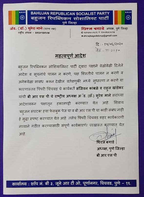 सर्वजीत बनसोडे,संजीवन कांबळे,राहुल खांडेकर यांची BRSP अॅड सुरेश माने यांच्या पक्षातुन हक्कलपट्टी