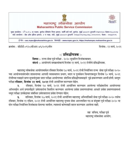 महाराष्ट्र लोकसेवा आयोगाची राज्य सेवा पूर्व परिक्षा 2020 पाचव्यांदा पुढे ढकलण्यात आली होती . ही परीक्षा आता 21 मार्च रोजी होणार असल्याचे अधिकृत परिपत्रक आयोगाकडून जारी करण्यात आले आहे.