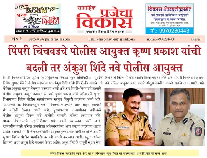 पिंपरी चिंचवडचे पोलीस आयुक्त कृष्ण प्रकाश यांची बदली तर अंकुश शिंदे नवे पोलीस आयुक्त
