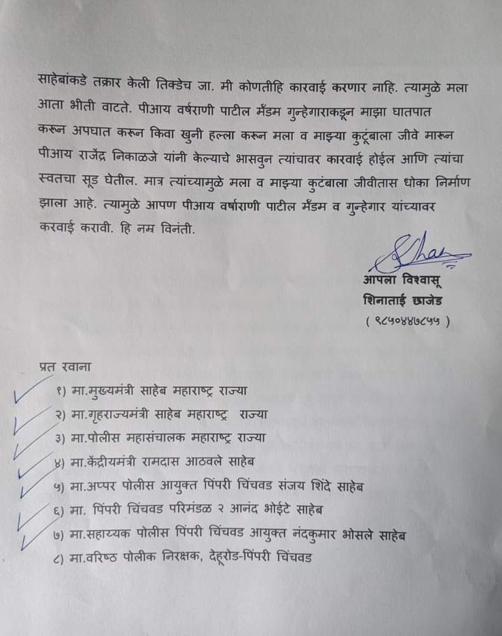 देहूरोड पोलीस स्टेशनच्या वरिष्ठ पोलीस निरीक्षक वर्षाराणी पाटील यांच्यापासून जीवाला धोका असल्याचे पत्र सोशल मीडियावर व्हायरल त्या पत्राची चौकशी करून आयुक्त साहेब कारवाई करतील का ?