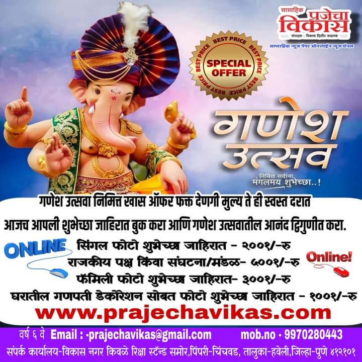 सर्वांना शुभेच्छा द्यायच्या मग चिंता कशाला प्रजेचा विकास या ऑनलाइन चॅनल वरून आपल्या प्रभागात, आपल्या विभागात, आपल्या जिल्ह्यात संपूर्ण महाराष्ट्रभर प्रसारित होणाऱ्या बातम्यांच्या माध्यमातून आपली जाहिरात ही प्रसारित केले जाते तेही संपूर्ण आपल्या परिसरात आपल्या विभागात शहरात जिल्ह्यात तालुक्यात संपूर्ण महाराष्ट्र भर, ना परवानगीची गरज ना कोणाच्या मागे लागण्याची गरज आपल्या शुभेच्छा व्यक्त करण्याची व शुभेच्छा देण्याचे योग्य ठिकाण प्रजेचा विकास- साप्ताहिक न्युज पेपर ऑनलाईन न्यूज चॅनल आजच आपली शुभेच्छा जाहिरात देऊन या गणेशोत्सवात प्रजेचा विकास सोबत सामील होऊया आणि सर्वांना शुभेच्छा देऊन आपला आनंद द्विगुणित करूया