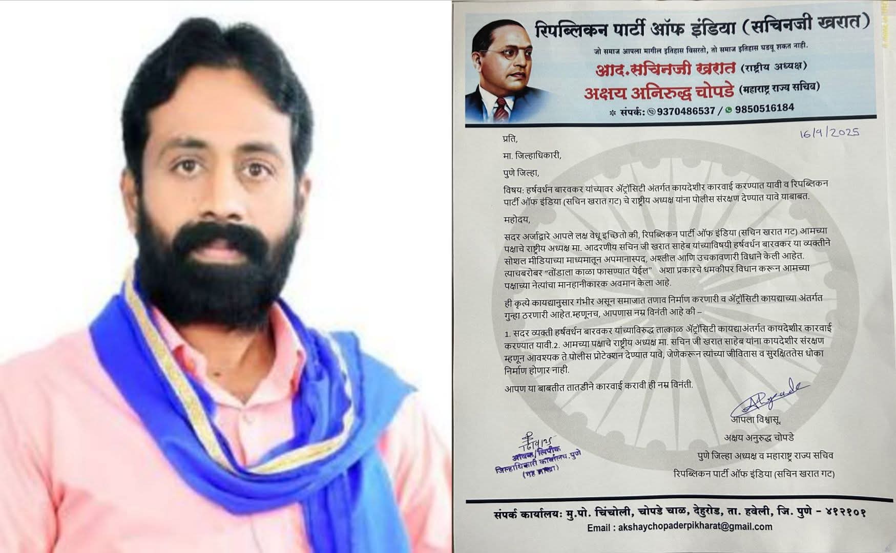 पुणे,दि.१७ सप्टेबंर २०२५ (प्रजेचा विकास ऑनलाइन न्यूज प्रतिनिधी):-रिपब्लिकन पार्टी ऑफ इंडिया (खरात गट) तर्फे मुख्यमंत्री सचिवालय कार्यालय तसेच जिल्हाधिकारी गृह कार्यालयात निवेदन देण्यात आले. या निवेदनाद्वारे हर्षवर्धन बारवरकर याला ताबडतोब अटक करून कडक कारवाई करण्याची मागणी करण्यात आली आहे.