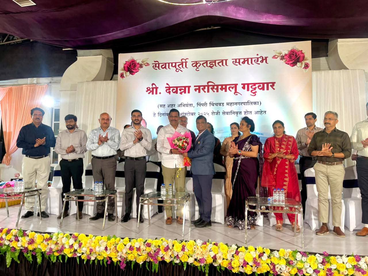 चिंचवड, दि. ३१ ऑक्टोबर २०२५ (प्रजेचा विकास न्यूज प्रतिनिधी):- पिंपरी-चिंचवड महानगरपालिकेचे सह-शहर अभियंता श्री. देवन्ना नरसिमलू गटुवार यांच्या सेवापूर्ती कृतज्ञता समारंभाचा कार्यक्रम काळेवाडी बीआरटी रोडवरील रागा पॅलेस येथे उत्साहात पार पडला.